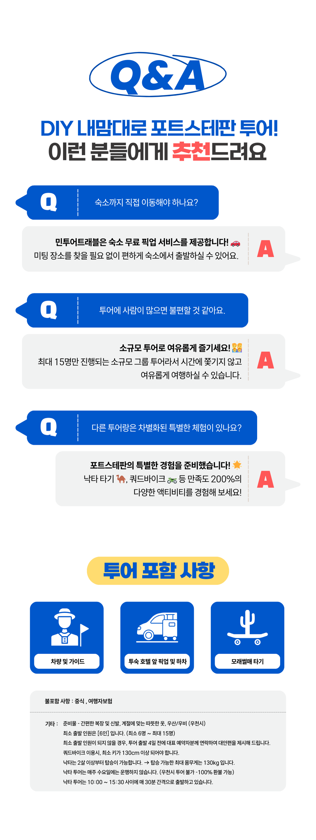 - 대표 상품인 포트스테판 낙타 타기와 쿼드바이크는 만족도 200%를 자랑합니다.