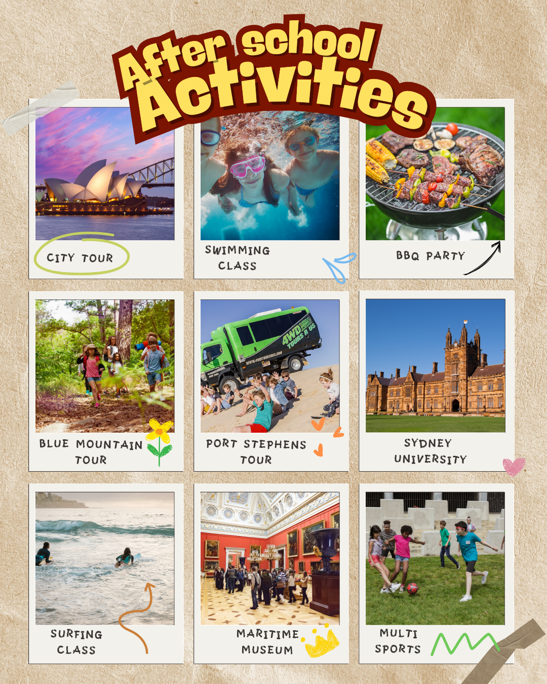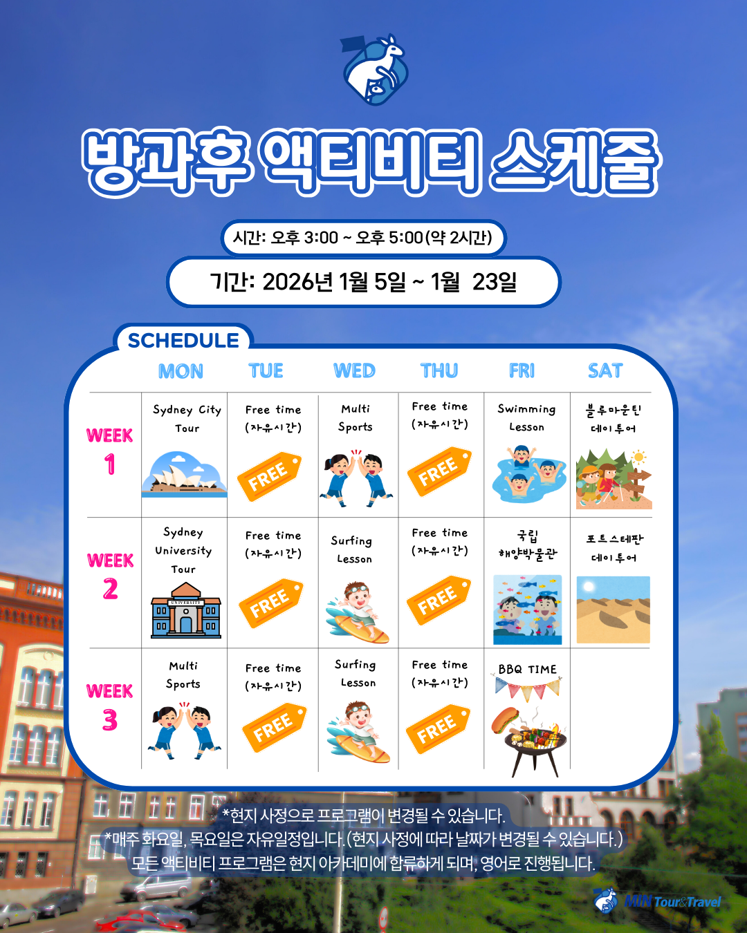 🖌️ 박물관투어 🛠️ 시드니 대학투어 ⚽ 멀티 스포츠🎭 BBQ 파티