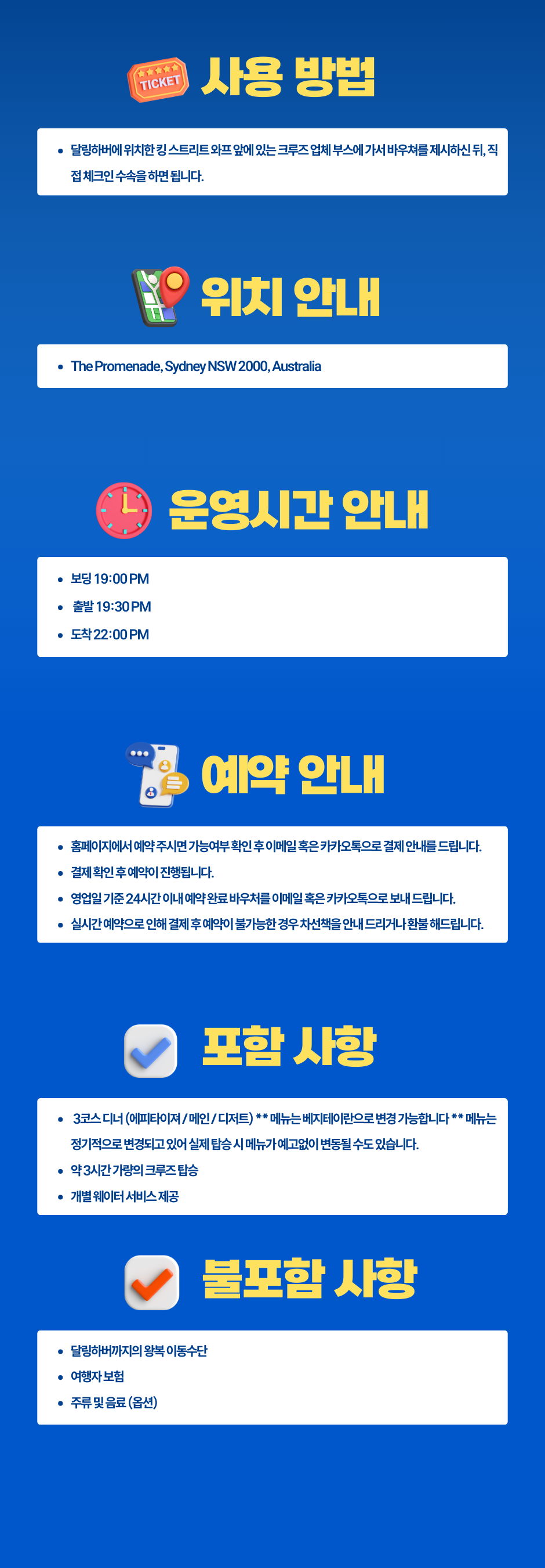 낮에 보는 모습과는 또 다른 아름다운 시드니를 만나볼 수 있습니다.