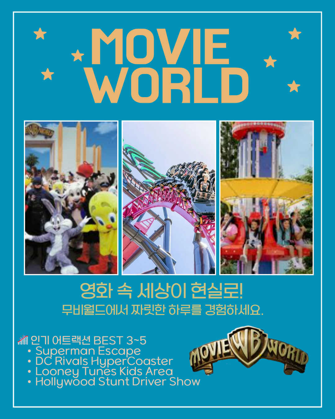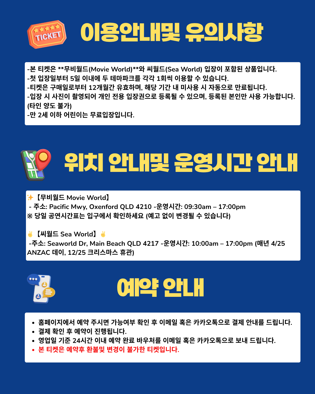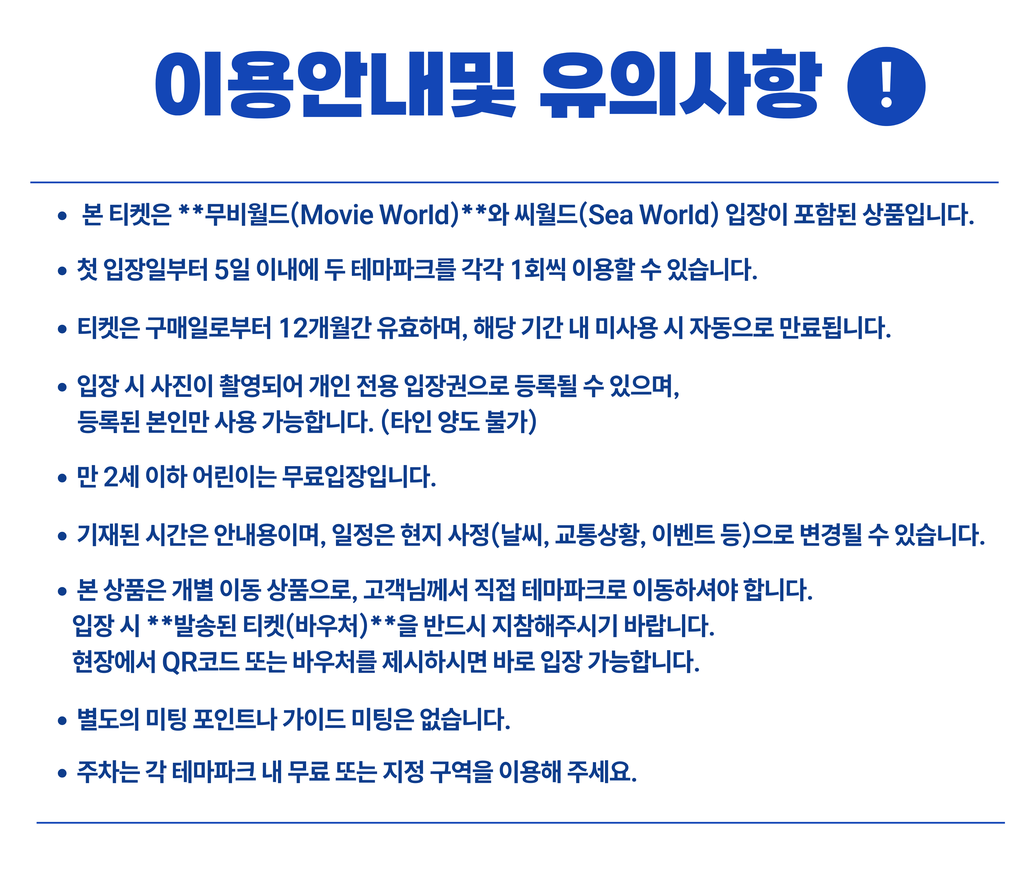 -본 티켓은 **무비월드(Movie World)**와 씨월드(Sea World) 입장이 포함된 상품입니다.