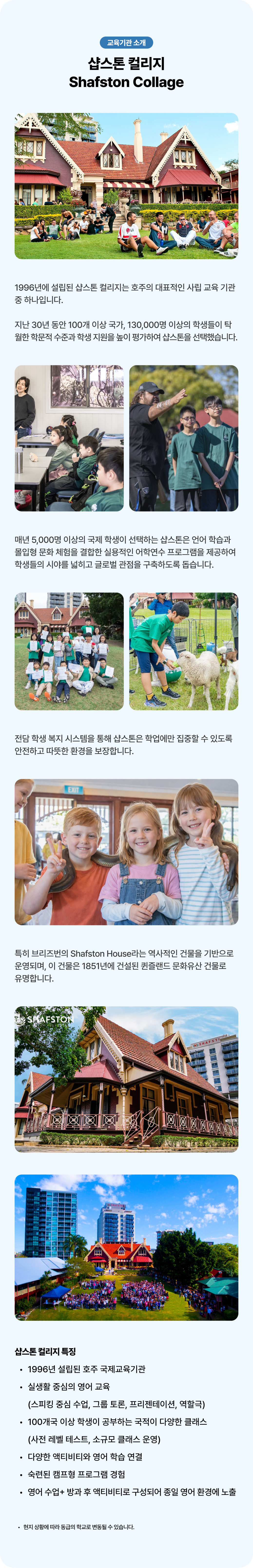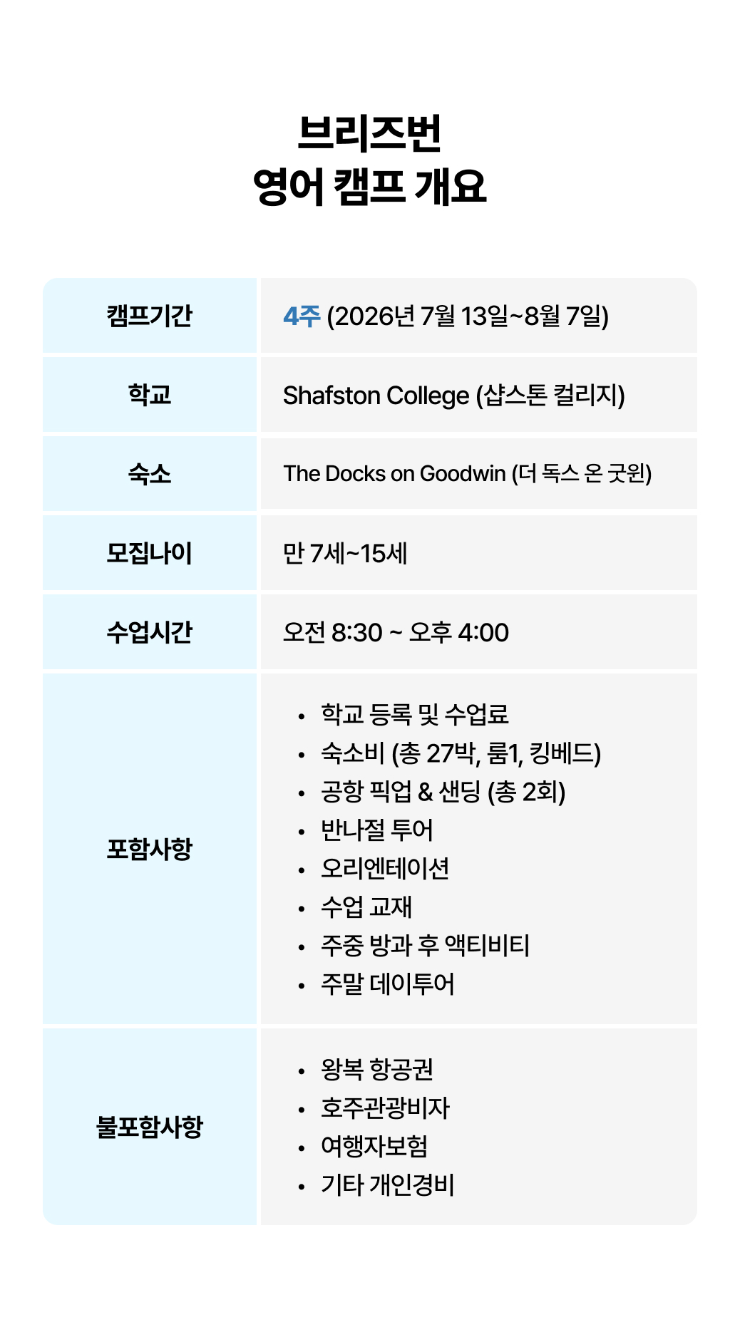📅 기간: 2026년 2026년 7월 13일~8월 7일 (4주) 📍 장소: 호주 브리즈번 👦 대상: 만 7세 ~ 15세 (🔹**소수 정예 맞춤형 클래스!**🔹) 학교 : Shafston College (샵스톤 컬리지) 숙소 : The Docks on Goodwin (더 독스 온 굿윈)